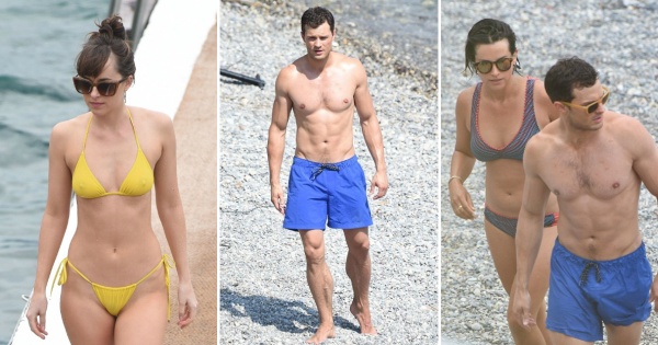 Ѕвездите од „Fifty Shades of Grey“: Џејми Дорнан со сопругата и Дакота Џонсон на плажа во Франција