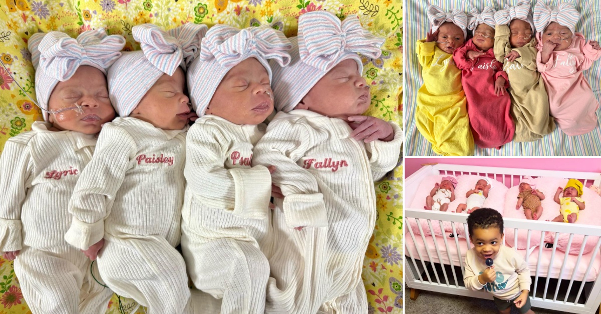 Среќната мајка се породи со царски рез и ги донесе на свет Лирик, Пејсли, Псалм и Фалин. Додека бебињата доаѓале на овој свет, нејзиниот сопруг влечел ливчиња на кои биле напишани имињата кои ги сакале за ќерките.
