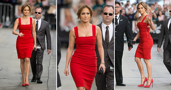 Џенифер Лопез каде и да се појави, не останува незабележана. За гостувањето во шоуто на Џими Кимел, сексапилната актерка и пејачка избра црвен фустан кој ги потенцираше нејзините облини.