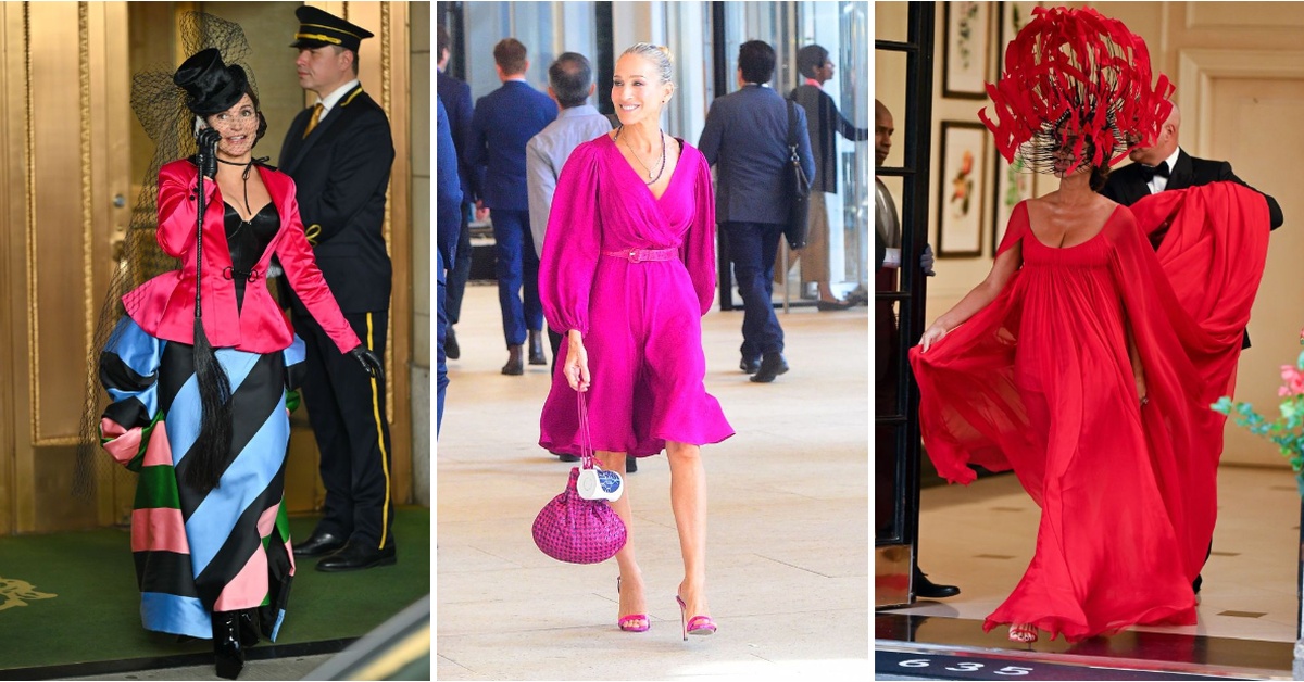 На снимањето по њујоршките улици, Паркер носеше свилен циклама фустан со долги широки ракави кој ја нагласува нејзината женственост. Креацијата е надополнета со колан на половината, минималистички розови сандали и текстурирана чанта.