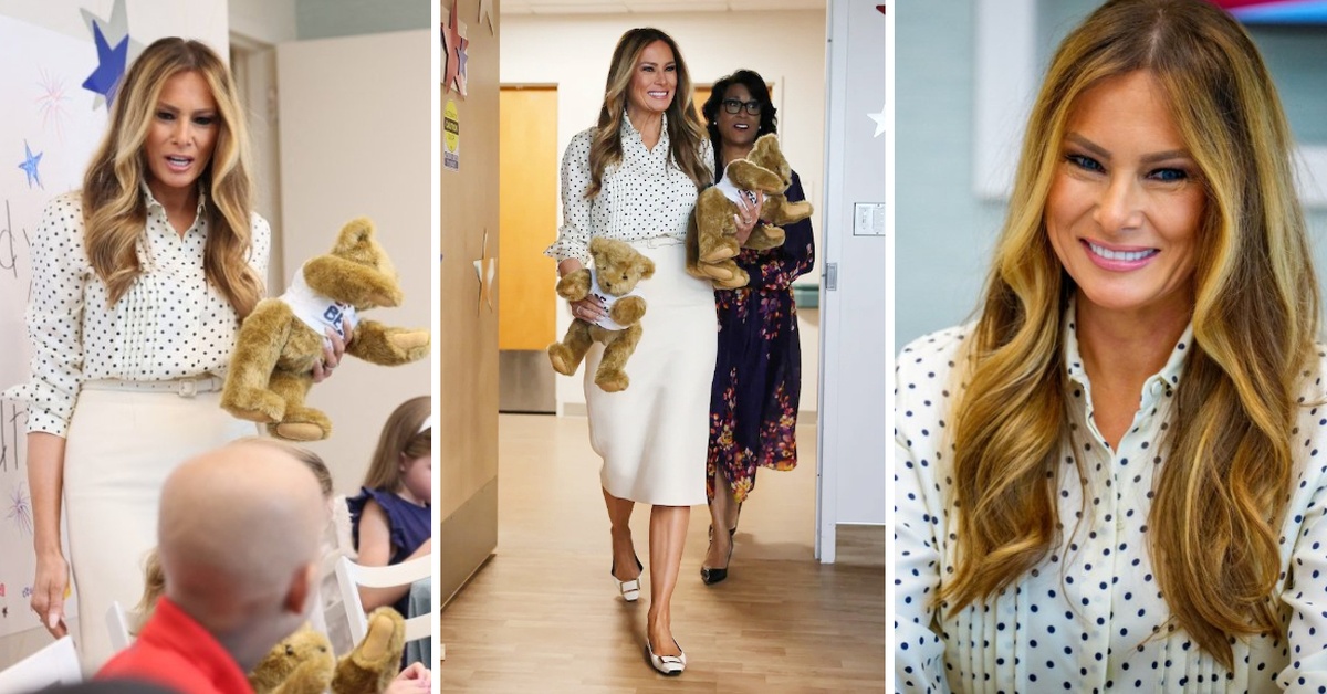 55-годишната прва дама на САД се појави ненадејно и ги изненади малите пациенти. Сопругата на претседателот Доналд Трамп разговараше, црташе и си играше со дечињата, а им донесе и подароци.