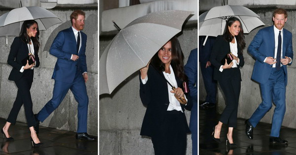 Во дождливиот Лондон, Меган носеше црн костум од британскиот бренд Александар МекКвин.