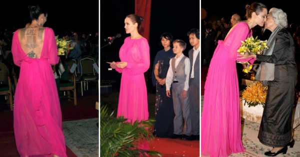 Холивудската ѕвезда го истакна својот шарм во розов фустан кој го разголуваше нејзиниот грб. На филмскиот настан, Џоли беше придружувана од своите шест деца – Медокс, Пакс, Захара, Шајло и близнаците Нокс и Вивиен.