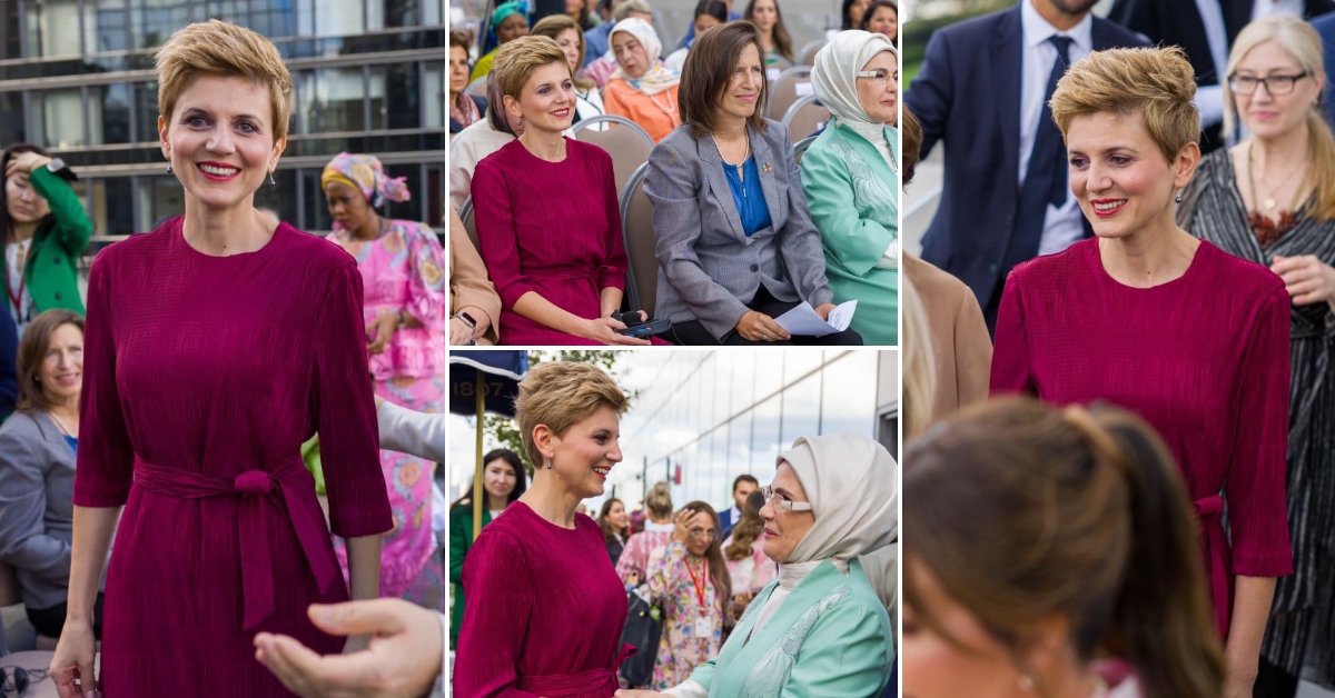 Елена Ковачевска, сопругата на премиерот, елегантна во фустан во бургундец нијанса во Њујорк