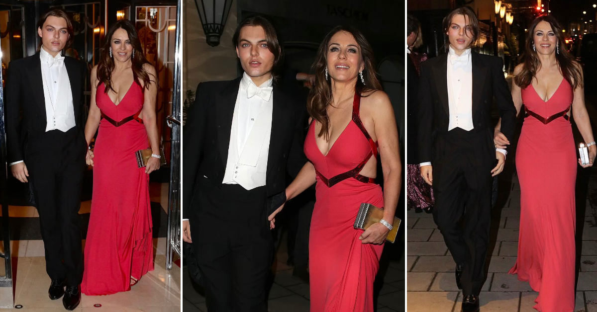56-годишната актерка носеше црвен фустан со длабоко деколте додека чекореше рака за рака со 19-годишниот син, кој е модел.