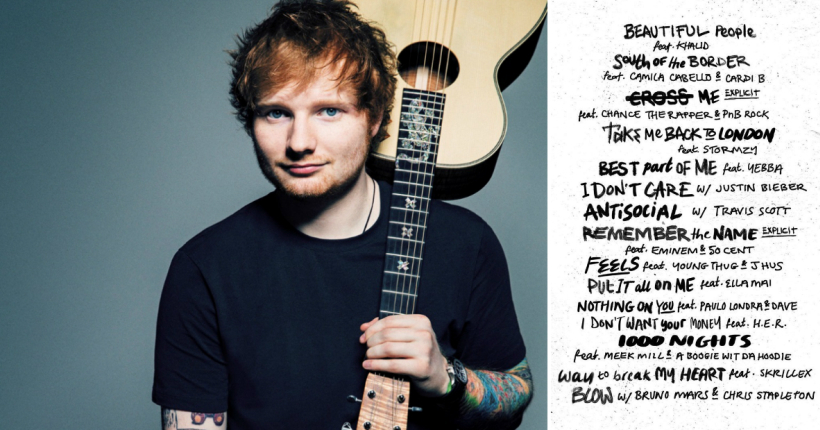 На YouTube каналот на 28-годишниот пејач, утрово се најдоа необјавените 10 песни од неговиот најнов музички проект. Камила Кабејо, Карди Би, Еминем, 50 Cent и Тревис Скот се само дел од имињата со кои Ед сними нова музика.