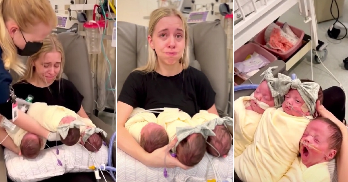 Мајка не можеше да си ги задржи солзите кога за првпат ги зеде во раце сите три бебенца. По раѓањето, тие беа раздвоени 61 ден и се обединија во мајчината прегратка.