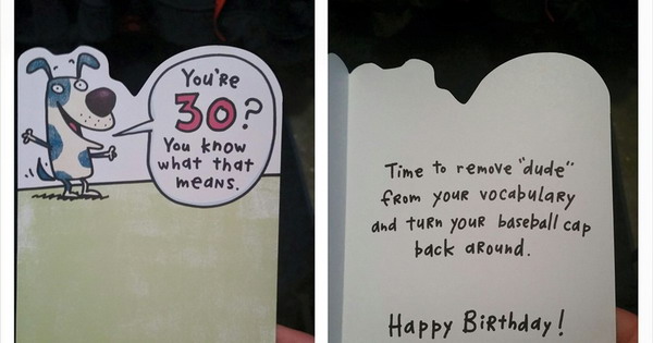 „Наполни 30? Знаеш што значи тоа.... Време е да го отфрлиш зборот „батка“ од твојот речник и да престанеш да ја носиш твојата бејзбол капа наопаку“ – пишува во картичката.