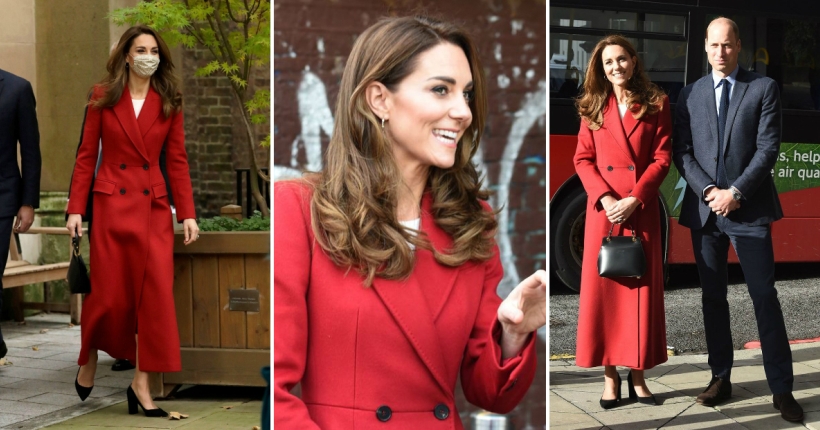38-годишната Војвотка носеше долго црвено палто од британската модна куќа Александар МекКвин кое го искомбинира со црни обувки и чантичка.