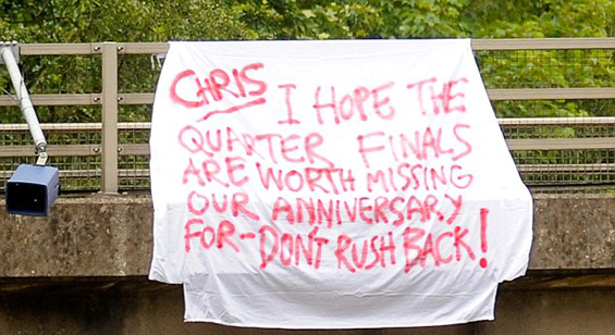 „Крис, се надевам дека вреди да ја пропуштиш нашата годишнина заради четврт-финалињата. Не брзај да се вратиш!“ – пишува на платното.
