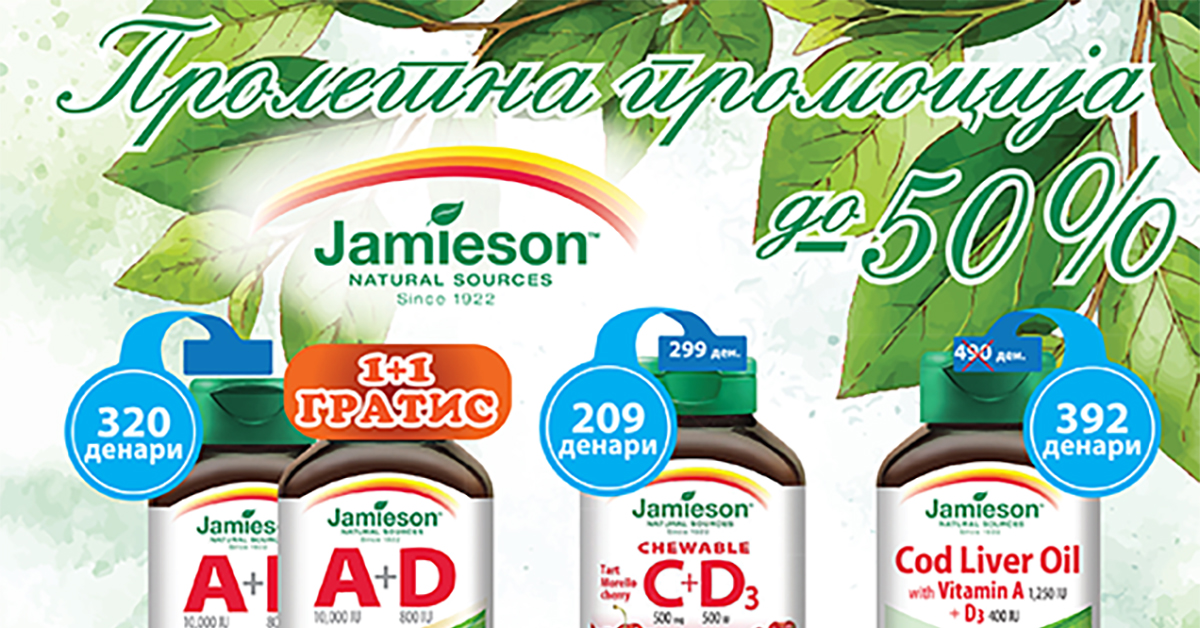 Оваа пролет продолжуваме со промоција и намалени цени и до 50% на дел од прозводите на Jamieson. Посетете ја најблиската Еурофарм аптека и побарајте Jamieson производи, наменети за целото семејство.