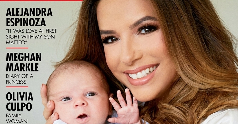 На корицата на списанието, Лонгорија е прерадосна додека го држи во рацете малиот Сантијаго Енрике Бастон.