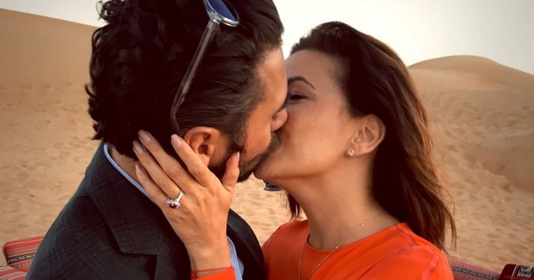 На фотографијата, парот се бакнува сред пустина во Дубаи, а на левата рака на Лонгорија блеска голем прстен.