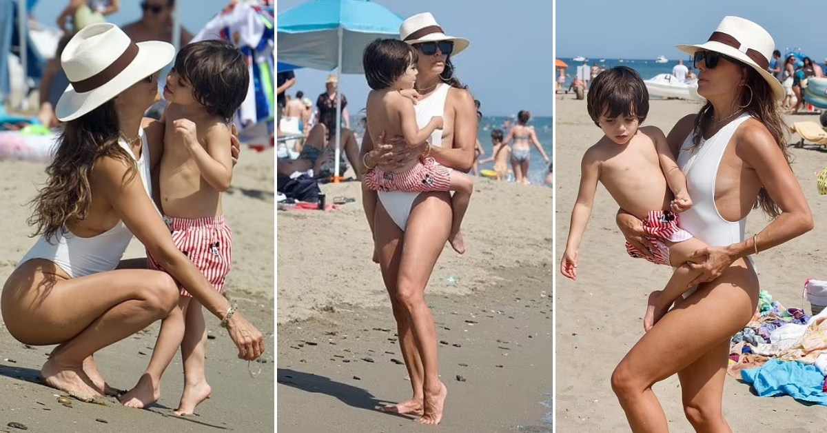47-годишната ѕвезда од „Очајни домаќинки“ беше фотографирана на плажа во Марбела со синчето Сантијаго. Убавата актерка носеше едноделен бел костим за капење од Myra Swim додека се дружеше со 4-годишното момче.