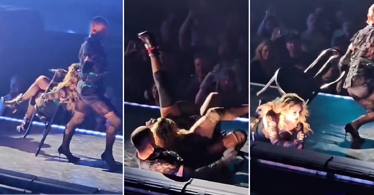 65-годишната пејачка падна од стол кој го влечеше танчар на штикли. Во видеото кое стана хит, легендарната музичка ѕвезда седи на стол како дел од кореографија на песната „Open Your Heart“. Кога танчарот започнува да ја влече, се сопнува и паѓа заедно со неа.