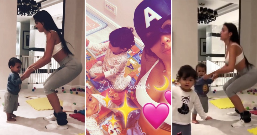 24-годишната девојка на Кристијано Роналдо сподели видеа во кои вежба покрај трите мали деца во детската соба.