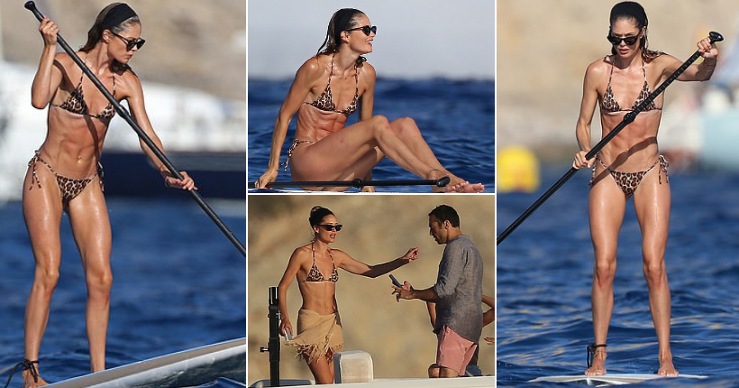 За време на одморот на Ибица, 34-годишниот поранешен ангел на Victoria’s Secret привлекуваше внимание со тонираните стомачни мускули за кои доби бројни комплименти. Популарната манекенка, која е мајка на две деца, носеше бикини со леопардски принт.