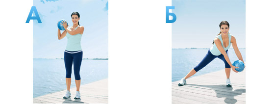 А. Застанете исправени и стапалата поставете ги на иста ширина како рамената. Држете ја топката блиску до десното уво, така што лактите да ви бидат свиткани.Б. Исчекорете налево и потклекнете, а истовремено однесете ја топката кон надворешната страна од глуждот на левата нога. Вратете се во првобитната положба.