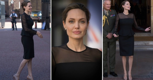 41-годишната сопруга на Бред Пит изгледаше елегантно во црн фустан со пеплум и бежови обувки.