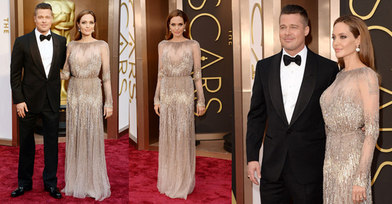 38-годишната ѕвезда зрачеше со гламур покрај својот свршеник Бред Пит, кој се здоби со Оскар за филмот „12 Years a Slave“. Џоли носеше обувки од Ферагамо и накит од Роберт Прокоп, додека Пит за свеченоста избра одело од Том Форд.