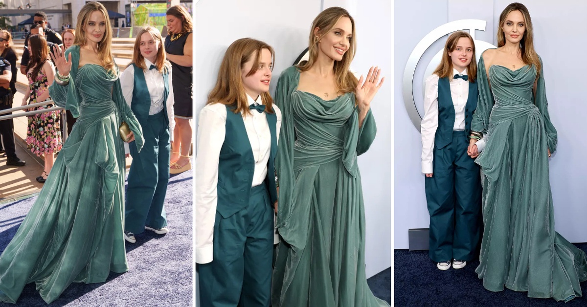 Убавата холивудска ѕвезда изгледаше како божица во кадифена креација со наметка од Версаче, а Вивиен носеше широки панталони и елече во складна нијанса, кои ги надополни со класична бела кошула.
