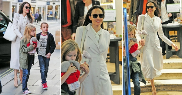 41-годишната актерка беше фотографирана од папараците на шопинг со 8-годишните близнаци и 10-годишната ќерка Шајло во Лондон. Елегантната мајка на шест деца облечена во бела комбинација со насмевка ја водеше за рака ќерка си Вивиен, додека Нокс и Шајло чекореа покрај нив.