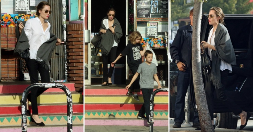 Белата кошула Џоли ја искомбинира со црни панталони, црни балетанки и сив шал, а црвениот камрин и малите бисерни обетки само ја засилија женственоста во нејзиниот стајлинг.