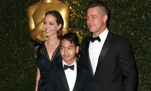 Облечена во црн долг фустан од Версаче, Џоли позираше покрај својот свршеник Бред Пит и синот Медокс.