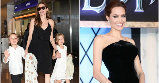 39-годишната актерка пристигна во Токио по повод премиерата на филмскиот хит „Maleficent“. На зелениот тепих Анџелина зачекори во елегантна кадифена креација од високата мода на Версаче. Црниот фустан таа го искомбинира со високи црни чевли од Сен Лоран.