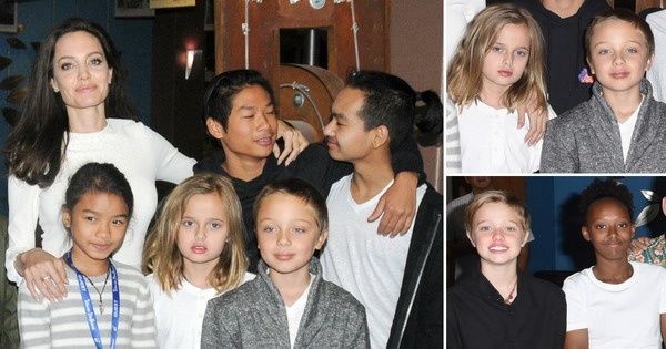 42-годишната оскаровка позираше со 16-годишниот Медокс, 13-годишниот Пакс, 12-годишната Захара, 11-годишната Шајло и 9-годишните близнаци Шајло и Нокс на премиерата на „First They Killed My Father“. Заедно со нив беше и Лун Ун, по чија книга е сниман филмот, и младите актери кои имаат главна улога.