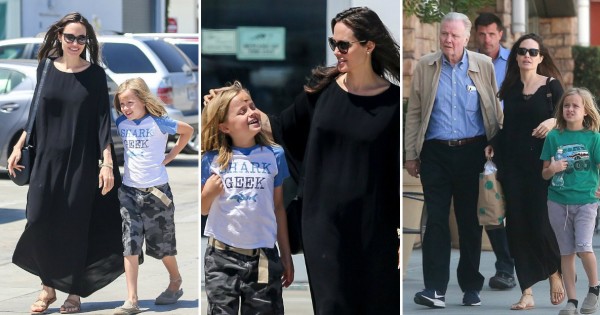 42-годишната ѕвезда беше фотографирана за време на пазарување со малата ќерка Вивиен. Облечена во црн широк фустан и со минимална шминка, Џоли се смешкаше покрај
