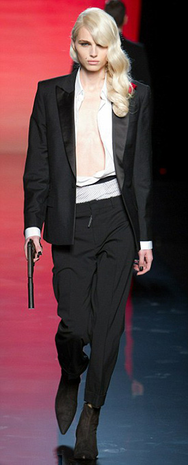 Популарниот модел очигледно го има воодушевено Готје, затоа што беше дел и од неговата ревија за машка облека инспирирана од Џејмс Бонд.