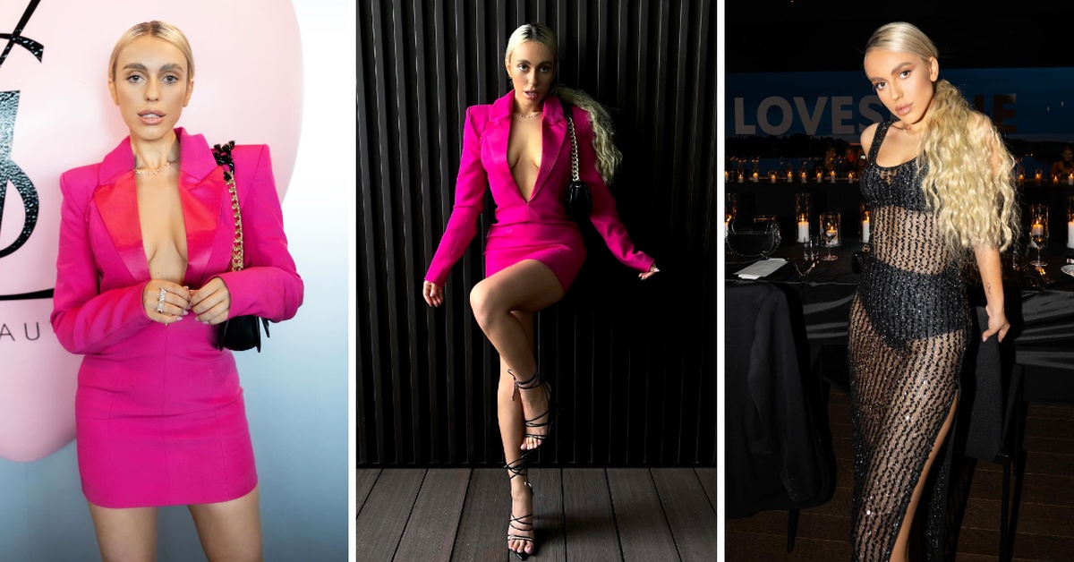 За промотивниот настан, Антониа избра ултра кратко фустанче во циклама боја со отворено деколте. Својот изглед таа го комплетираше со ланче од Chapter03 на кое пишува Ciao Bella.