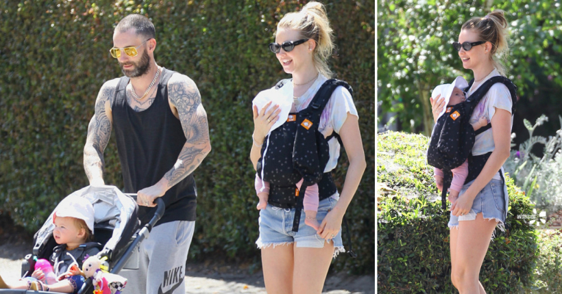 29-годишниот ангел на Victoria’s Secret и 39-годишниот пејач беа фотографирани за време на нивната семејна дружба во Лос Анџелес, Калифорнија. На фотографиите, славната манекенка ја носи 4-месечната Џо Грејс во кенгур, додека фронтменот на Maroon 5 ја турка количката со едногодишната Дасти Роуз.