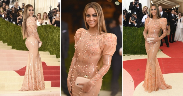 Креацијата декорирана со ситни бисери е дело на модната куќа Живанши. Популарната сопруга на Џеј Зи со драматична шминка и бежова чантичка го финишираше својот изглед за гала вечерта во музејот на уметноста „Метрополитен“.