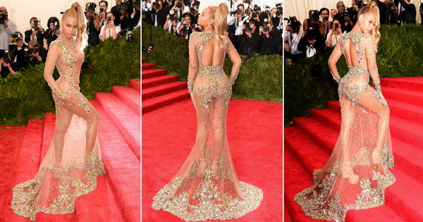 Бијонсе самоуверено позираше пред музејот на уметноста „Метрополитен“ во проѕирен фустан. Стратешки поставените кристали во боја ги покрија интимните делови од телото на музичката ѕвезда.