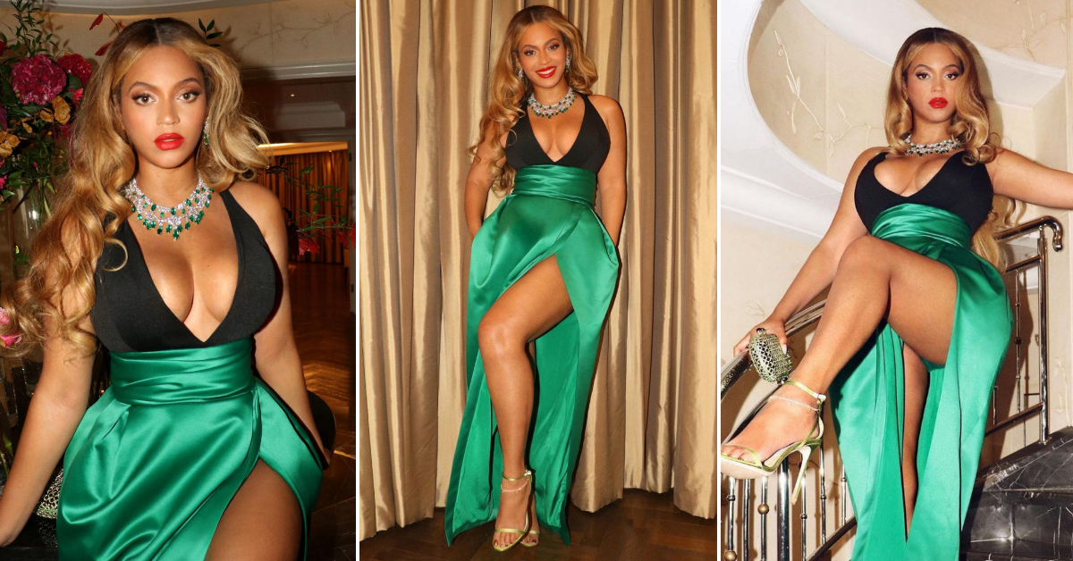 40-годишната музичарка заводливо позираше на скалите во италијанскиот ресторан „Harry’s Bar“ лоциран во Лондон. Зелената креација со потпис на Александар Воте, Бијонсе ја надгради со блескава огрлица од дијаманти и смарагди.