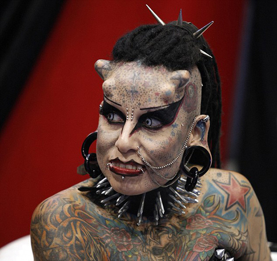 35-годишната мајка има тетоважи на скоро 100% од своето тело, а освен тоа има всадени рогови на челото, вампирски заби и неколку пирсови.