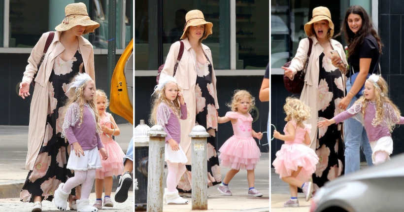 На фотографиите, харизматичната ѕвезда од серијата „Gossip Girl“ носи фустан со цветови, мантил и шешир, додека слатките девојчиња трчаат околу неа.