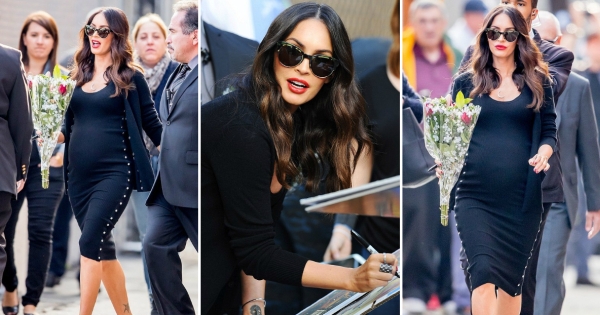 Меган Фокс изгледа атрактивно и во напредна бременост. 30-годишната актерка шармираше додека се упатуваше кон студиото на Џими Кимел во Холивуд.