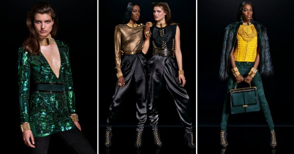Во лимитираната колекција дизајнирана од Оливие Рустан, креативниот дизајнер на Balmain, доминираат широки колани на половината, нагласени раменици, припиени фустани, крзнени палта и впечатливи модни додатоци.