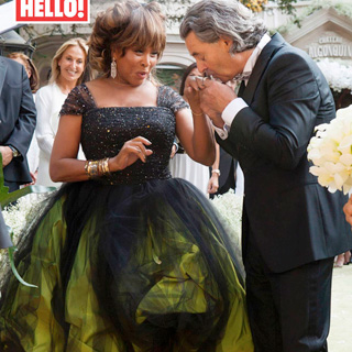 Невообичаениот невестински фустан од зелена тафта и црн свилен тул, украсен со сваровски кристали, е дело на Џорџо Армани.