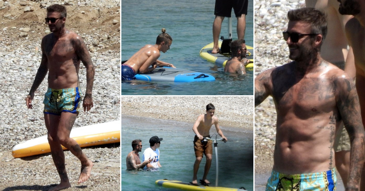 Откако беше на одмор во Италија со целото свое семејство, 45-годишниот поранешен фудбалер отпатува во Грција со синовите Бруклин, Ромео и Круз. Дејвид носеше костим за капење од Версаче додека уживаше и се забавуваше со своите деца.