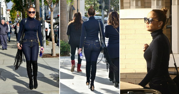 Облечена во тесни фармерки, класична ролка и високи чизми, Лопез ги намами објективите на папараците.