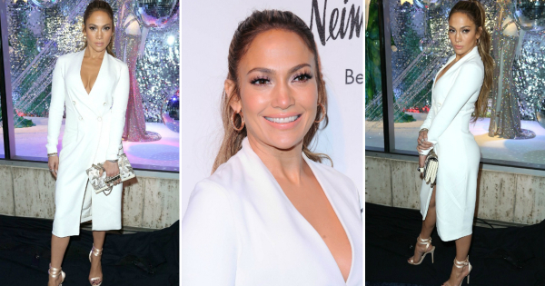 47-годишната пејачка пристигна на свечениот настан облечена во бел фустан со длабоко деколте од Cushnie et Ochs и секако сандали од својата колекција со талентираниот дизајнер. Лопез позираше и пред излогот на продавницата каде се наоѓа незаборавниот зелен фустан кој таа го носеше на Греми во 2000 година.