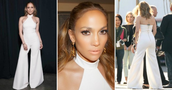 Светлата креација доаѓа од колекцијата есен/зима 2016 на Vatanika. Својот стилски избор, Лопез го надополни со обувки од Брајан Етвуд и обетки од Версаче.