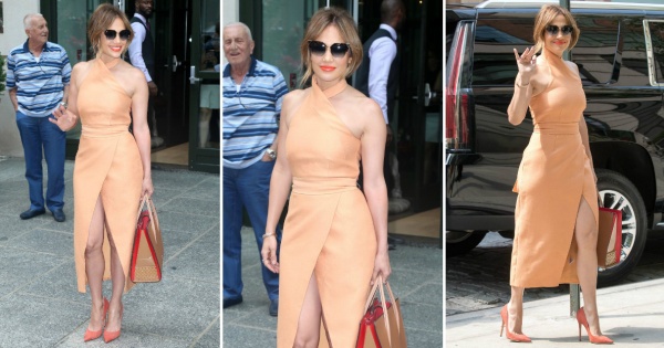 Џенифер Лопез знае како да привлече внимание кон себе. 46-годишната пејачка во фустан во праска боја беше фотографирана додека се упатуваше на настан за собирање средства за поддршка на претседателската кампања на Хилари Клинтон.