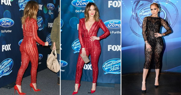 На настанот организиран во чест на талентираните финалисти на последната сезона од музичкото шоу, Лопез заблеска во црвен комбинезон од Зухаир Мурад кој максимално ги истакна нејзините облини. Креацијата од колекцијата есен 2015 висока мода на либанскиот дизајнер е надополнета со обувки од Џими Чу и чантичка од Аманда Вејкли.