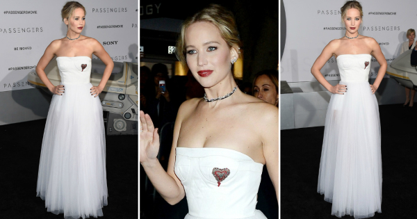На црниот тепих, Џенифер Лоренс зачекори во бело издание и ги привлече погледите на присутните. Долгата креација со тул на 26-годишната актерка доаѓа од модната куќа Диор, нејзините обувки го носат потписот на Кристијан Лобутин, а накитот е од Beladora и Repossi.