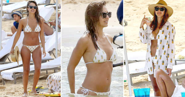 35-годишната актерка и бизнисменка беше фотографирана на плажа во бели бикини со принтови со ананас.